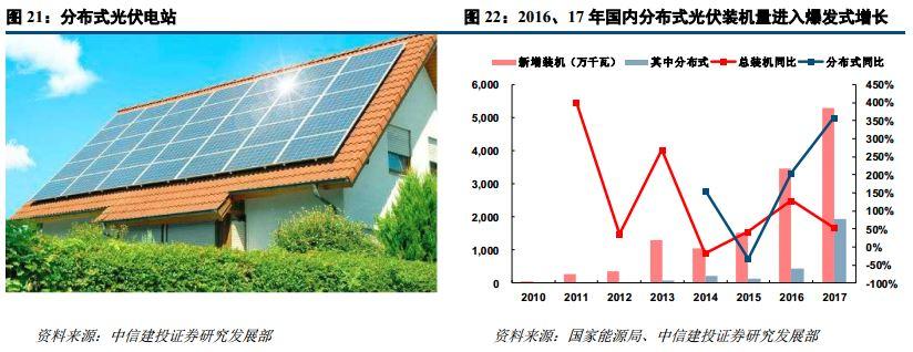 分布式光伏發(fā)電迎來發(fā)展新契機。 分布式光伏發(fā)電具有靠近用戶側(cè)、建設(shè)規(guī)模靈活、安裝簡單、適用范圍廣的特點,是光伏發(fā)電重要的應用形式,此前分布式光伏發(fā)電由于投資成本高、風險大、商業(yè)模式不成熟、金融機構(gòu)參與意愿低等原因,發(fā)展相對緩慢。自 2016 年起,隨著燃煤發(fā)電上網(wǎng)價格下調(diào)、光伏發(fā)電標桿電價下調(diào),政策逐步向分布式光伏發(fā)電傾斜,分布式光伏電站迎來春天。 2016、 2017 年分布式光伏發(fā)電連續(xù)兩年呈現(xiàn)爆發(fā)式增長,其中 2017 年全年新增裝機 1944 萬千瓦,同比增加 358%。