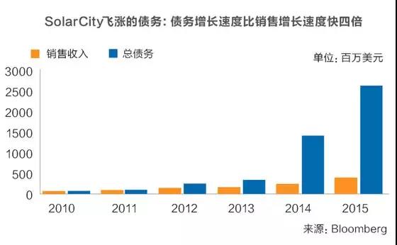 并購(gòu)前,SolarCity和特斯拉市值相差十幾倍,債務(wù)卻相差無(wú)幾,過(guò)去五年的時(shí)間里,SolarCity債務(wù)增長(zhǎng)速度卻比銷售額增長(zhǎng)快四倍。由于公司虧損惡化以及債務(wù)高企,SolarCity的營(yíng)業(yè)現(xiàn)金流入與支付利息現(xiàn)金流出呈現(xiàn)出了更為夸大的背離。
