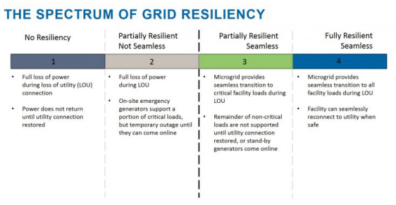 圖中所示的微電網(wǎng)彈性范圍從沒有彈性到完全具有彈性,并且可以實現(xiàn)從連接到電網(wǎng)的實際無縫過渡。沒有部署微電網(wǎng)的客戶(例如住宅用戶)在電網(wǎng)中斷期間將會完全中斷。一旦電力公司診斷并解決了電網(wǎng)中斷或故障,其電力才會恢復正常。