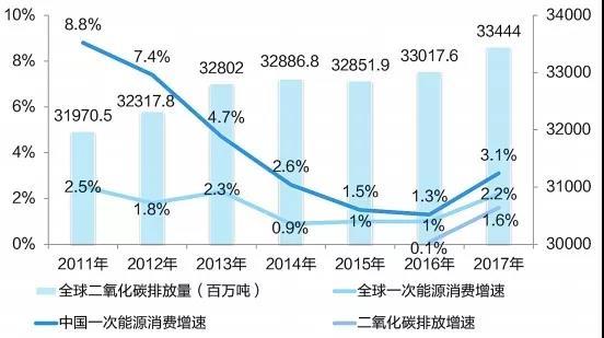 全球經(jīng)濟(jì)的復(fù)蘇也伴隨著能源需求的增長(zhǎng)。2017年全球能源需求增速為2.1%,超過(guò)其10年平均增速,約為2016年的2倍。盡管從長(zhǎng)遠(yuǎn)來(lái)看全球能源需求增速仍趨于放緩,但是從目前到2040年,全球能源總需求增幅仍將達(dá)到30%以上,特別是亞洲發(fā)展中國(guó)家的能源需求增幅占全球增幅的2/3以上。其中,化石燃料滿足了全世界超過(guò)70%的能源需求,盡管可再生能源發(fā)展迅猛,但是化石燃料仍會(huì)在未來(lái)30年中維持較為穩(wěn)固的主導(dǎo)地位。而化石燃料消費(fèi)的增長(zhǎng)也就不可避免地帶來(lái)了碳排放的增加,這也是世界經(jīng)濟(jì)復(fù)蘇帶來(lái)的必然結(jié)果。