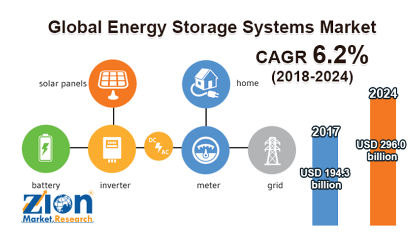 中國儲(chǔ)能網(wǎng)訊:根據(jù)錫安市場研究(Zion Market Research)公司的一份最新的調(diào)查報(bào)告,2017年全球儲(chǔ)能系統(tǒng)市場收入約為1943億美元,預(yù)計(jì)到2024年底將產(chǎn)生約2960億美元的收入,2018年到2024年的復(fù)合年增長率約為6.2%。