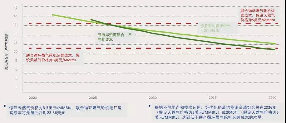 圖3:2020-2040年間聯(lián)合循環(huán)燃?xì)廨啓C(jī)運(yùn)營成本與清潔能源資源組合平準(zhǔn)化成本對比