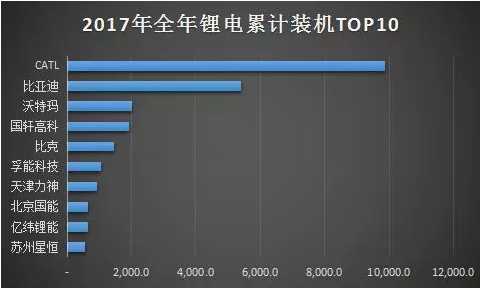 中國化學(xué)與物理電源行業(yè)協(xié)會(huì)秘書長劉彥龍?jiān)诮盏囊粓稣搲兄赋觯?017年前5家企業(yè)動(dòng)力電池配套量占六成以上;前20家企業(yè)配套量占比87%。而根據(jù)該協(xié)會(huì)發(fā)布的2017年全年鋰電累計(jì)裝機(jī)排名(如上圖),企業(yè)鋰電配套占比與以上情況也大體一致。此外,中汽研相關(guān)數(shù)據(jù)同樣顯示,2017年前2家動(dòng)力電池配套量占該年度總配套量的45%左右,前10家企業(yè)配套量占比近70%。由此可見,國內(nèi)動(dòng)力電池行業(yè)集中度正在進(jìn)一步提升。
