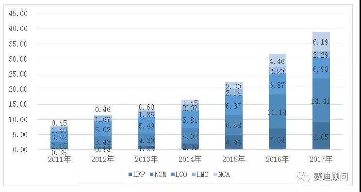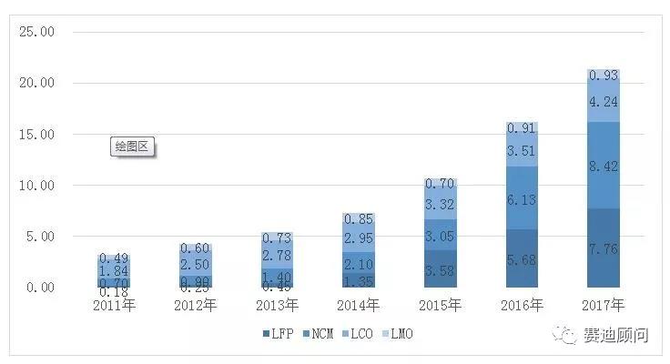 2011年—2017年全球鋰電正極材料銷量(萬(wàn)噸)