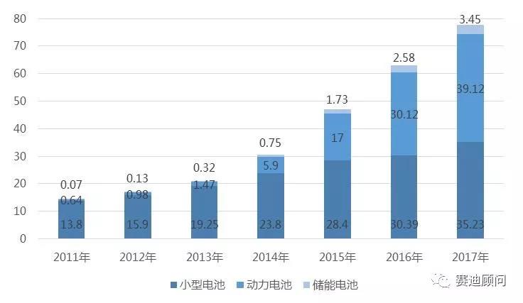 2011年—2017年全球不同類型鋰電池出貨量(GWh)