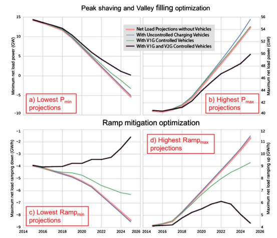 通過調(diào)度大量電動汽車在日間充電而不是傍晚充電,將有助于通過儲存剩余電量來平衡電網(wǎng)的供需。根據(jù)美國能源部的勞倫斯伯克利國家實驗室的新分析,調(diào)度電動汽車充放電對鴨子曲線的影響相當(dāng)于增加了1千兆瓦時的儲能容量,其成本為14.5億美元到17.5億美元。
