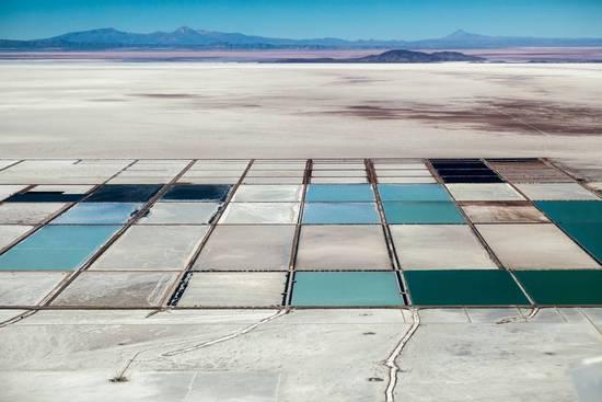 (圖示:玻利維亞的阿塔卡瑪高原。鹽水從附近的湖中抽出,注入一系列蒸發(fā)池中,并持續(xù)12至18個(gè)月。當(dāng)溶液變得更濃時(shí),不同的礦物質(zhì)會(huì)在不同的時(shí)間結(jié)晶。工廠會(huì)用石灰處理以除去鎂。當(dāng)這些礦物準(zhǔn)備加工時(shí),它們會(huì)被帶到附近的Planta Li鋰工廠,生產(chǎn)用于制造電池的鋰離子。2017年,該工廠生產(chǎn)了20噸碳酸鋰。)