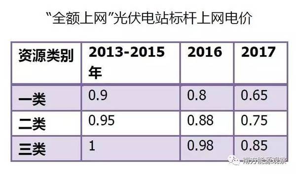 集中式電站執(zhí)行光伏電站標(biāo)桿上網(wǎng)電價(各資源區(qū)上網(wǎng)電價標(biāo)準(zhǔn)見下表)。上網(wǎng)電價高出當(dāng)?shù)厝济簷C(jī)組標(biāo)桿上網(wǎng)電價(含脫硫等環(huán)保電價)的部分,通過可再生發(fā)展基金予以補(bǔ)貼。