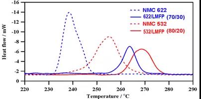 三元+LMFP的作法已被許多電池廠認(rèn)證,三元混摻20%~30%LMFP的復(fù)合材料與純?nèi)牧舷啾?,熱分解溫度提?~10%且放熱量降低40~60%(如圖一所示),證實(shí)可從材料的本質(zhì)徹底解決三元一直以來存在的安全問題,動力電池產(chǎn)業(yè)如今要從523轉(zhuǎn)向安全疑慮更高的622及811,若只靠政策的松綁,終究是不能解決安全的問題。此問題一日未解,始終會是一顆未爆彈,SONY、三星的慘痛代價(jià)仍記憶猶新,作為企業(yè)的領(lǐng)導(dǎo)者不得不謹(jǐn)慎以對。