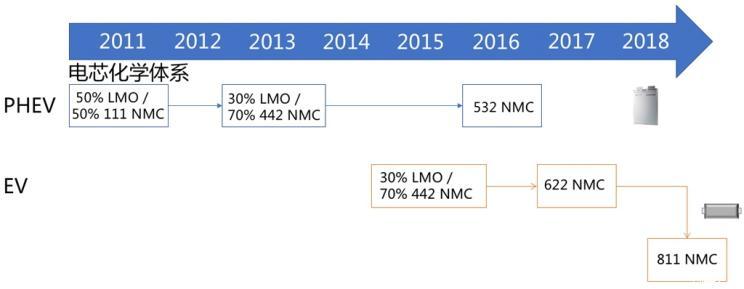 動(dòng)力電池從磷酸鐵鋰往三元鋰路線的轉(zhuǎn)移并不是一蹴而就,如下圖所示,在國(guó)內(nèi)快速轉(zhuǎn)化之前,國(guó)外電池企業(yè)已經(jīng)在電芯化學(xué)體系上做了一些變革。之所以給我們“忽如一夜春風(fēng)來(lái)”的感覺(jué),主要還是我們?cè)诹姿徼F鋰的路線上堅(jiān)持了比較長(zhǎng)的時(shí)間。當(dāng)2016年以后普遍轉(zhuǎn)向三元鋰電芯開(kāi)發(fā),一下子跟上了日韓的技術(shù)路徑。