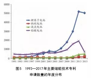 圖5為1993-2017年主要儲能關(guān)鍵技術(shù)專利申請數(shù)量年度變化圖,如圖所示,進(jìn)入21世紀(jì)之前,鉛酸電池技術(shù)的專利產(chǎn)出明顯高于其他三種儲能技術(shù),直到2003年被鋰離子電池超越。從年度專利變化來看,鋰離子電池的專利產(chǎn)出在2008年后開始大幅增長,專利數(shù)量遙遙領(lǐng)先其他電池技術(shù),成為最熱儲能技術(shù)。