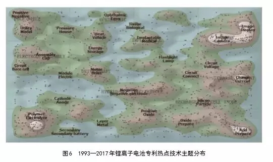 利用ThomsonInnovation平臺的專利地圖功能,結(jié)合專利分類號的分析,我們對鋰離子電池、鈉硫電池、液流電池及鉛酸電池專利技術(shù)熱點進(jìn)行了分析。圖6為鋰離子電池的專利熱點技術(shù)地圖,可以看出,鋰離子電池專利的熱點技術(shù)主題包括:(1)聚合物電解質(zhì);(2)正極、負(fù)極氧化物材料研究;(3)儲能、電動汽車及圖像處理技術(shù)應(yīng)用;(4)充放電研究;