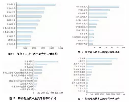 儲能關(guān)鍵技術(shù)領(lǐng)域,日本企業(yè)具有較大領(lǐng)先優(yōu)勢。鋰離子電池領(lǐng)域,松下、索尼、豐田和三洋排名前四位(圖11所示);鈉硫電池領(lǐng)域,礙子(NGK)、日立、湯淺、東京電力排名前4位,中國上海電氣鈉硫儲能技術(shù)公司排名第5位(圖12所示);液流電池領(lǐng)域,日本住友、中國科學(xué)院、日本明電舍、日本關(guān)西電力、中國大連融科排名前5位(圖13所示);鉛酸電池領(lǐng)域,日本湯淺、松下、新神戶和古河電池專利申請量排名前4位,中國超威、天能、理士國際排名5-7位(圖14所示)。