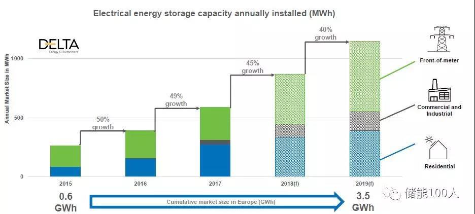 根據(jù)歐洲儲能協(xié)會最新發(fā)布的《歐洲儲能市場檢測報告》顯示,2017年歐洲電力儲能設備裝機容量接近600MWH,相比于2016年的400MWH,增速高達49%。其中,工商業(yè)儲能和戶用儲能增速明顯高于電網(wǎng)端儲能,成為增長的主力軍。