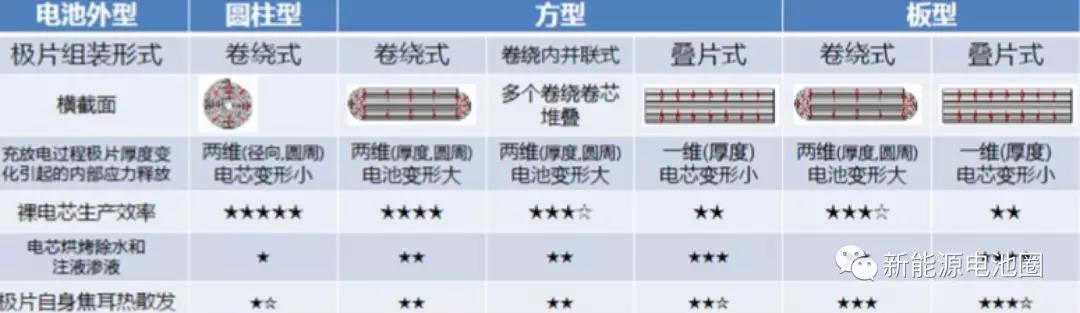 電芯從正負極材料的角度來看目前有NCM(111,523,622,811),LCO,LFP,LMO,LTO等。車企要從能量密度,功率特性,循環(huán)壽命和安全性的維度進行篩選。另外從電池封裝形狀上又可分為圓柱,軟包(疊片和卷繞),方形(疊片,卷繞,并聯(lián)卷繞)。各個類型的電芯主要特點總結如下: