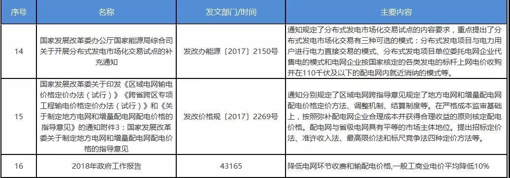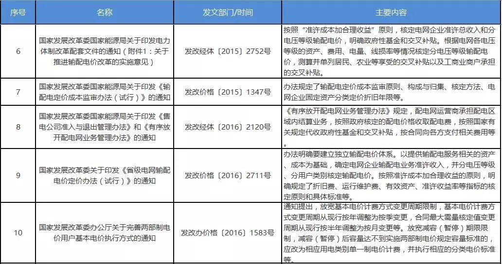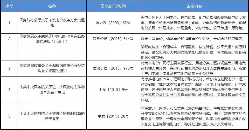1.輸配電價(jià)改革正按照“管住中間、放開兩頭”的電價(jià)改革總體思路不斷深化?!秶?guó)務(wù)院辦公廳關(guān)于印發(fā)電價(jià)改革方案的通知》(國(guó)辦發(fā)〔2003〕62號(hào))明確規(guī)定了輸配電價(jià)改革的原則和方向,給后續(xù)政策制定奠定了堅(jiān)實(shí)基礎(chǔ)?!吨泄仓醒雵?guó)務(wù)院關(guān)于進(jìn)一步深化電力體制改革的若干意見》(中發(fā)〔2015〕9號(hào))進(jìn)一步將電價(jià)改革作為首要任務(wù),明確提出單獨(dú)核定輸配電價(jià),按“準(zhǔn)許成本加合理收益”原則,分電壓等級(jí)核定等要求。