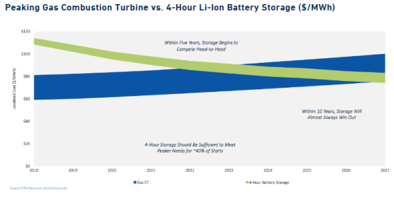 根據(jù)這些研究結(jié)果,公用事業(yè)公司可能會(huì)將注意力從用戶側(cè)的儲(chǔ)能資產(chǎn)(即特斯拉Powerwalls)轉(zhuǎn)移到大型電網(wǎng)側(cè)儲(chǔ)能應(yīng)用中,以替代日前老舊的天然氣峰值發(fā)電廠。由于對(duì)燃?xì)獍l(fā)電的要求很高,美國(guó)各州計(jì)劃采用儲(chǔ)能技術(shù)提供新的電力調(diào)峰能力。