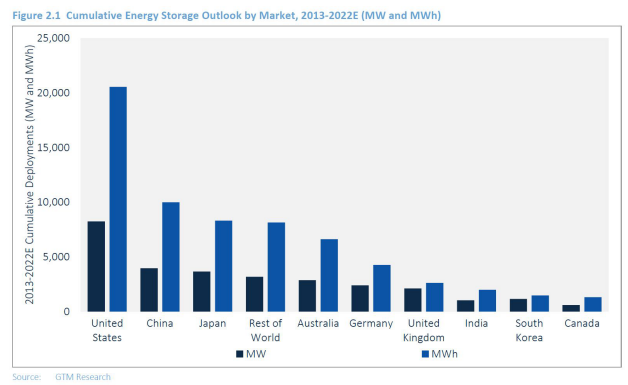 美國(guó)企業(yè)和實(shí)驗(yàn)室在開(kāi)發(fā)電網(wǎng)儲(chǔ)能方面發(fā)揮了先導(dǎo)作用,因此,其早期的部署超過(guò)其他國(guó)家是理所當(dāng)然的。GTM研究公司儲(chǔ)能研究主管Ravi Manghani說(shuō),大量部署電池儲(chǔ)能系統(tǒng)的關(guān)鍵是其創(chuàng)新的市場(chǎng)設(shè)計(jì)。