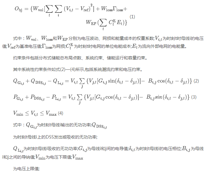 目前,分布式儲(chǔ)能的應(yīng)用場(chǎng)景主要包含用戶(hù)側(cè)、分布式電源側(cè)和配網(wǎng)側(cè)3個(gè)方面,其投資主體包括用戶(hù)、分布式電源投資商和電網(wǎng)公司,多以分布式電源、用戶(hù)側(cè)或微電網(wǎng)為背景引入,電動(dòng)汽車(chē)也是其中的一種重要組成。在配網(wǎng)中,關(guān)于分布式儲(chǔ)能規(guī)劃技術(shù)的研究主要涉及容量?jī)?yōu)化配置及選點(diǎn)布局2個(gè)方面,并且當(dāng)需要同時(shí)開(kāi)展容量和選點(diǎn)研究時(shí),鑒于二者間存在的強(qiáng)耦合關(guān)系,在目前國(guó)內(nèi)外開(kāi)展的研究中,往往將之作為一體化問(wèn)題處理,多通過(guò)將分布式儲(chǔ)能規(guī)劃描述為一個(gè)優(yōu)化問(wèn)題,優(yōu)化目標(biāo)和約束條件隨應(yīng)用場(chǎng)景和應(yīng)用目標(biāo)而變。優(yōu)化目標(biāo)主要包括技術(shù)性目標(biāo)和經(jīng)濟(jì)性目標(biāo)兩類(lèi),約束條件一般包含儲(chǔ)能設(shè)備布局總點(diǎn)數(shù)、儲(chǔ)能本身和系統(tǒng)運(yùn)行方面的約束條件。