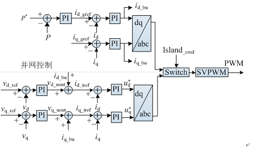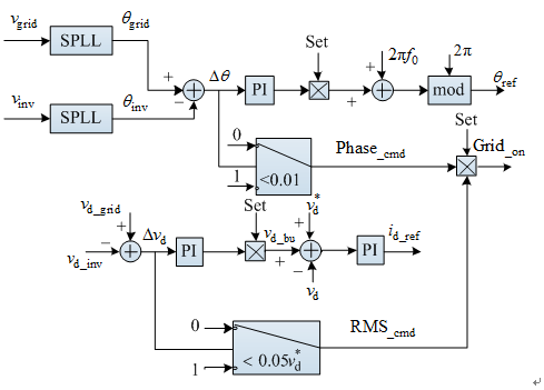 在一些特殊的場(chǎng)合下,分布式儲(chǔ)能設(shè)備需要有并網(wǎng)和離網(wǎng)運(yùn)行2種工作模式,這2種工作模式之間的切換需要盡可能平滑,減小對(duì)用戶(hù)或電網(wǎng)的沖擊和影響,使分布式儲(chǔ)能設(shè)備能夠柔性接入和退出的控制技術(shù)是實(shí)現(xiàn)分布式儲(chǔ)能設(shè)備即插即用的基礎(chǔ)。通過(guò)并網(wǎng)切換孤島過(guò)程補(bǔ)償算法與孤島切換并網(wǎng)過(guò)程預(yù)同步方法[31]可以實(shí)現(xiàn)2種工況的無(wú)縫切換,具體控制策略見(jiàn)圖3和圖4,圖中變量定義參見(jiàn)文獻(xiàn)[31]。