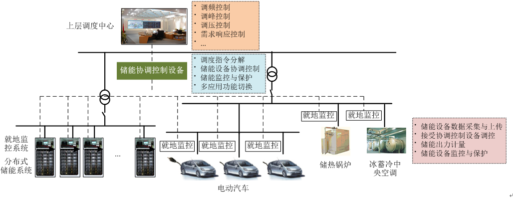 伴隨配網(wǎng)側(cè)分布式儲(chǔ)能的快速發(fā)展,面向電網(wǎng)的儲(chǔ)能資源匯聚應(yīng)用將包含電池儲(chǔ)能設(shè)備、通過(guò)V2G并網(wǎng)的電動(dòng)汽車(chē)、儲(chǔ)熱鍋爐、冰蓄冷中央空調(diào)等分布式儲(chǔ)能設(shè)備,通過(guò)多設(shè)備間的協(xié)調(diào)控制,參與電網(wǎng)調(diào)峰、調(diào)頻等應(yīng)用,如圖6所示。在這個(gè)過(guò)程中,儲(chǔ)能系統(tǒng)的協(xié)調(diào)控制設(shè)備在上層調(diào)度和各分散的分布式儲(chǔ)能資源間起到調(diào)度指令分解、儲(chǔ)能設(shè)備協(xié)調(diào)控制、儲(chǔ)能監(jiān)控與保護(hù)、多應(yīng)用功能切換等功能。