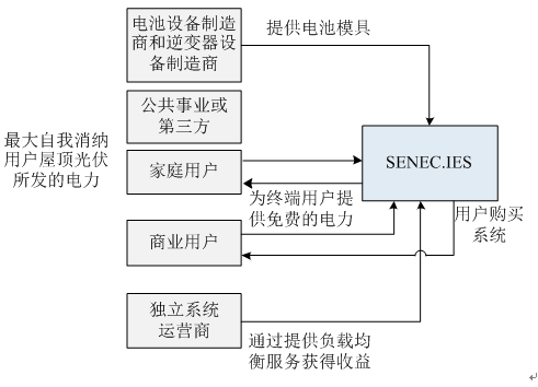 目前,與分布式光伏組合形成的分布式光儲(chǔ)系統(tǒng)在國(guó)外已有較多的商業(yè)應(yīng)用,在不同的國(guó)家,分布式光儲(chǔ)發(fā)電的應(yīng)用重點(diǎn)各不相同,美國(guó)加州在工商業(yè)領(lǐng)域的分布式項(xiàng)目居多,澳大利亞和德國(guó)市場(chǎng)的重點(diǎn)在戶(hù)用儲(chǔ)能領(lǐng)域。以德國(guó)SENEC.IES公司為例,該公司將用戶(hù)側(cè)儲(chǔ)能聚集起來(lái)開(kāi)展“免費(fèi)午餐”模式,享有對(duì)電池的主要控制權(quán),當(dāng)電網(wǎng)“零電價(jià)”時(shí)控制電池從電網(wǎng)充電。用戶(hù)主要通過(guò)最大化地自我消納屋頂光伏所發(fā)的電力、使用SENEC.IES 提供給用戶(hù)的“免費(fèi)儲(chǔ)存的電力”,實(shí)現(xiàn)更低的電費(fèi)賬單,進(jìn)而獲益。SENEC.IES的商業(yè)模式見(jiàn)圖7。