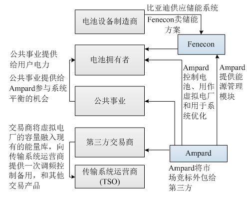 用戶(hù)為了增加自發(fā)自用而購(gòu)買(mǎi)儲(chǔ)能系統(tǒng),Ampard利用他們的能源管理系統(tǒng)(Ampard Energy Manager)將這些系統(tǒng)管理起來(lái),為這些儲(chǔ)能系統(tǒng)增加虛擬電廠的功能提供一次調(diào)頻控制和備用等服務(wù)。Fenecon/Ampard的商業(yè)模式見(jiàn)圖8。