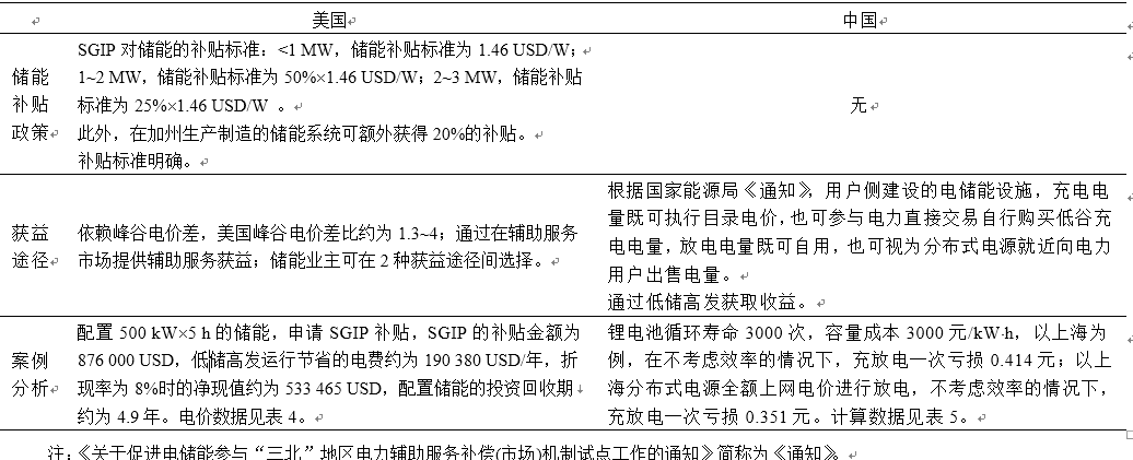 分布式儲(chǔ)能參與系統(tǒng)調(diào)峰,目前在美國(guó)已經(jīng)實(shí)現(xiàn)商業(yè)化運(yùn)營(yíng),針對(duì)這一應(yīng)用模式就目前中美兩國(guó)的應(yīng)用現(xiàn)狀進(jìn)行比較,如表3所示。