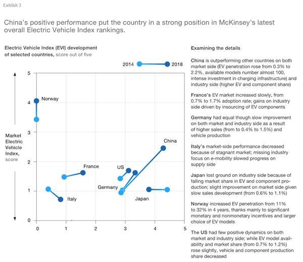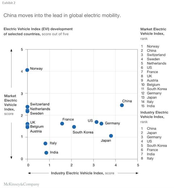 盡管如此,中國(guó)積極的市場(chǎng)表現(xiàn)幫助這個(gè)國(guó)家在麥肯錫最新的電動(dòng)汽車(chē)指數(shù)排名里獲得了強(qiáng)勢(shì)的地位,在其電動(dòng)汽車(chē)市場(chǎng)得分排行之前的只有挪威,并加強(qiáng)了其領(lǐng)先地位,排在其后的是日本、德國(guó)和美國(guó),這是在行業(yè)電動(dòng)汽車(chē)分析中的排名(供應(yīng)方面)。