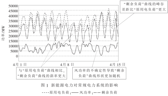 確保安全、高質(zhì)量供電,同時維持電力供需平衡是電力系統(tǒng)面臨的持續(xù)挑戰(zhàn)。社會的用電需求是實時變化的,晝夜和季節(jié)性用電負荷存在峰谷差,而電力供需平衡的常規(guī)調(diào)節(jié)方式是通過改變發(fā)電機組的出力來適應需求變化。在役發(fā)電機組可分兩類:承擔基本負荷的機組(下稱:基荷機組)和變負荷機組。基荷機組的出力基本維持不變,而變負荷機組的出力則隨需求的變化而變化。為分析新能源電力對常規(guī)電力系統(tǒng)的影響,將新能源發(fā)電量視為所減少的用電負荷,此時常規(guī)發(fā)電機組需要提供的電量等于原用電負荷減去新能源機組的發(fā)電量,文中定義為“剩余負荷”。對比“原用電負荷”和“剩余負荷”曲線,可說明新能源電力對常規(guī)電力系統(tǒng)的影響。圖1是美國Texas州某地區(qū)2005年的雙周用電負荷與風力發(fā)電數(shù)據(jù)[1]。