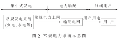 常規(guī)電力系統(tǒng)可簡化為如圖2所示,系統(tǒng)包括集中式發(fā)電、電力輸配、終端用戶3個環(huán)節(jié),系統(tǒng)運轉(zhuǎn)模式是“即用即發(fā)”,即發(fā)電端根據(jù)用戶端負荷的變化來調(diào)節(jié)發(fā)電量,此種運轉(zhuǎn)模式面臨著非??量痰淖冐摵梢蟆?