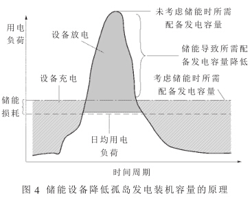 在電力系統(tǒng)中引入儲能模塊,在不同時間點進行電能吞吐,相當于在電力系統(tǒng)中添加了一個可調(diào)節(jié)維度,最終實現(xiàn)整個系統(tǒng)的高效、低成本和可靠運行。此外,電力儲能在離網(wǎng)孤島終端的使用也是其重要的應用場合,通過設置適當規(guī)模的電力儲能裝置,在用電低谷時充電、用電高峰時放電,會降低離網(wǎng)孤島終端所需匹配的發(fā)電能力/容量,同時使發(fā)電機組維持運行在穩(wěn)定工況,提高整個系統(tǒng)的能量效率和經(jīng)濟性能,圖4說明了其原理。
