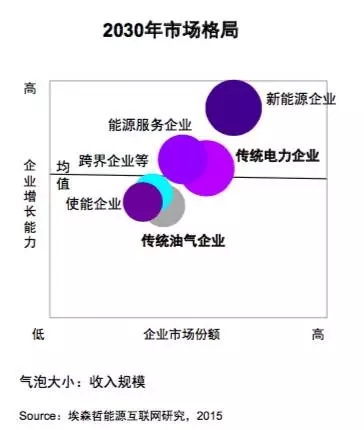 埃森哲預(yù)測,2030 年的中國市場,新能源企業(yè)的增長能力和市場份額都將超過傳統(tǒng)能源企業(yè),而能源服務(wù)企業(yè)、 使能企業(yè)和跨界企業(yè)也將憑借能源互聯(lián)網(wǎng)領(lǐng)域帶來的新增長點(diǎn)迅速崛起,甚至趕超傳統(tǒng)油氣企業(yè)。
