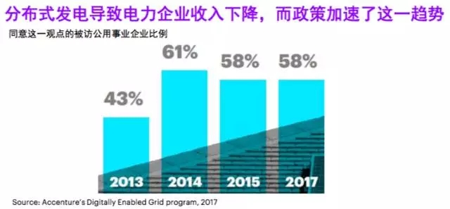 埃森哲近期一項(xiàng)全球調(diào)研顯示,有58% 的公用事業(yè)企業(yè)認(rèn)為分布式發(fā)電將使本企業(yè)收入下降,44% 的公用事業(yè)企業(yè)認(rèn)為微電網(wǎng)會影響本企業(yè)收入 。尤其在亞太地區(qū),傳統(tǒng)企業(yè)對分布式能源的這種抵觸情緒更強(qiáng)烈。
