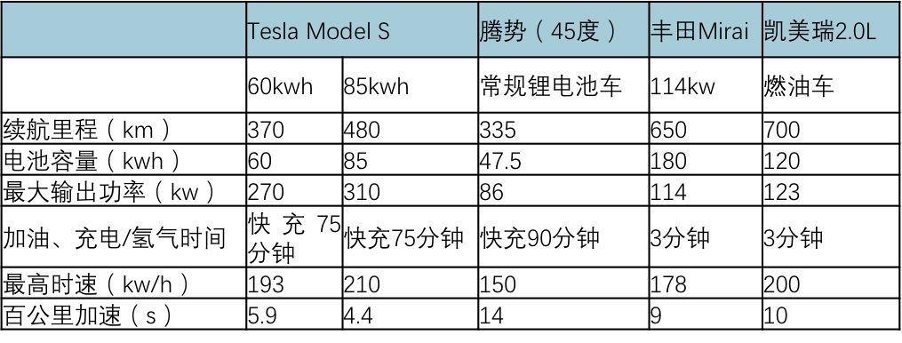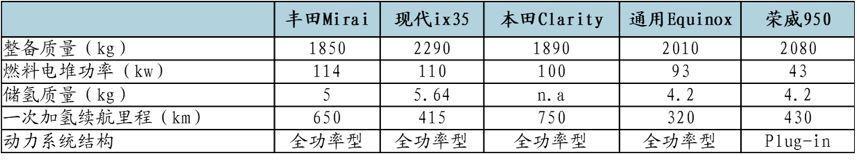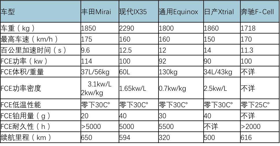 主流FCV參數(shù)對(duì)比