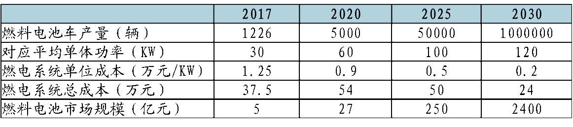 假設(shè)依據(jù)如下:根據(jù)2017年11月發(fā)布的《節(jié)能與新能源汽車(chē)技術(shù)路線圖》,我國(guó)燃料電池汽車(chē)的2020/2025/2030年的發(fā)展目標(biāo)分別為5,000/50,000/1,000,000輛。
