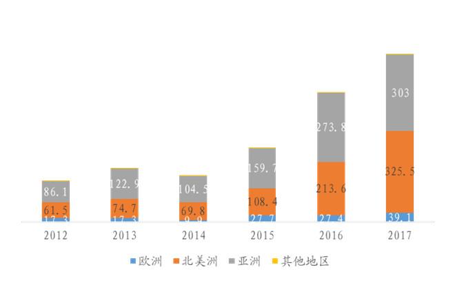 從全球各地區(qū)的出貨兆瓦數(shù)來(lái)看,目前北美與亞洲的燃料電池市場(chǎng)呈現(xiàn)分庭抗禮的局面,17年北美的出貨兆瓦數(shù)甚至高于亞洲(北美:325.5MW vs 亞洲:303MW)。