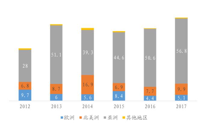 與此同時(shí)從全球各地區(qū)的出貨量來(lái)看,17年亞洲占據(jù)了全球約78%的燃料電池出貨量,達(dá)到5.7萬(wàn)套。