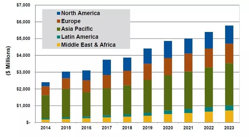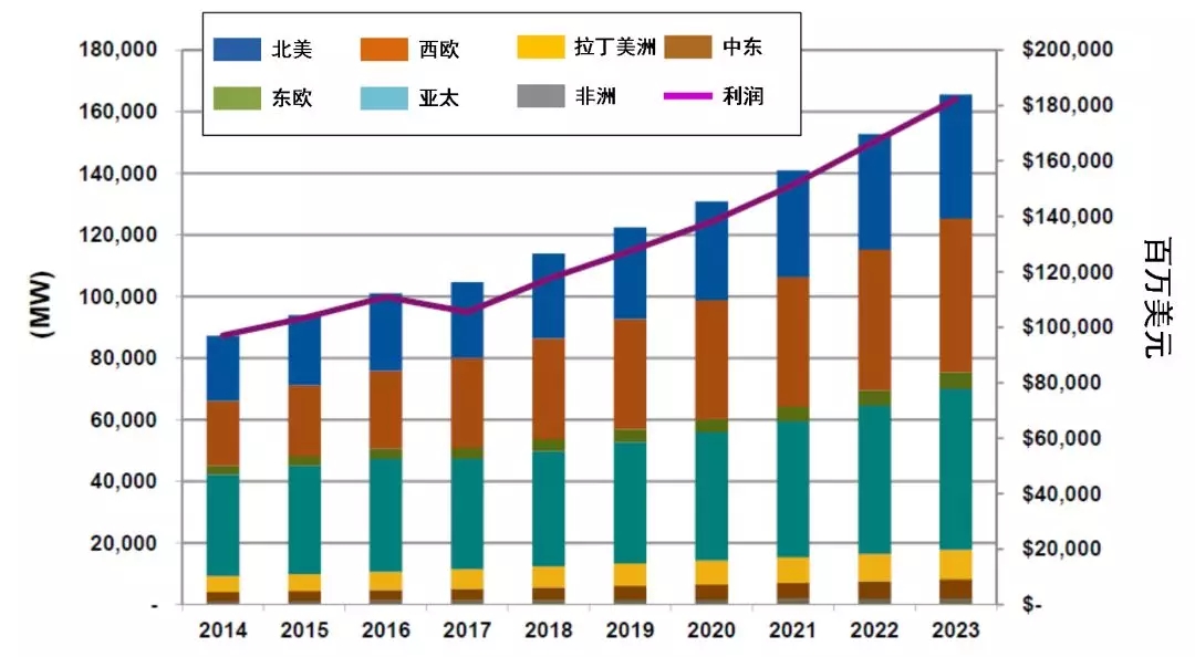 根據(jù)Navigant Research的研究,全球分布式電源容量2023年將達(dá)到16550萬千瓦。其中,北美、西歐和亞太地區(qū)將是領(lǐng)頭軍,尤其是亞太地區(qū),占比達(dá)到32%(5230萬千瓦)。