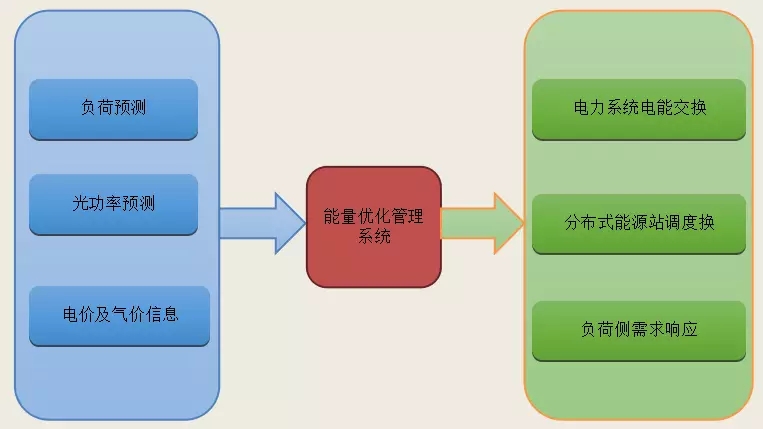 上圖是能源管理的系統(tǒng)結(jié)構(gòu)圖,系統(tǒng)將電動汽車充電站、樓宇能源綜合管控、燃?xì)廨啓C組、分布式光伏發(fā)電、用電量采集等數(shù)據(jù)上傳到高郵新區(qū)的能源管理中心,然后通過能量管理中心和主電網(wǎng)進行協(xié)調(diào)控制。