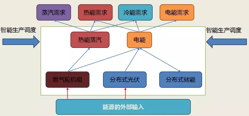 上圖是高郵市項目的系統(tǒng)功能關(guān)系圖。能源的外部輸入是天然氣,主要是提供熱能蒸汽和電能;通過分布式光伏主要為園區(qū)提供了電能,儲能是分布式能源的配套設(shè)備。