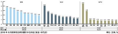 2016年1-8月,中國品牌汽車銷量前十名企業(yè)集團(tuán)依次為:上汽、長安、東風(fēng)、北汽、長城、江淮、吉利、奇瑞、華晨、一汽;中國品牌乘用車銷量前十名企業(yè)集團(tuán)依次為:上汽、長安、東風(fēng)、長城、北汽、吉利、奇瑞、比亞迪、廣汽、江淮。