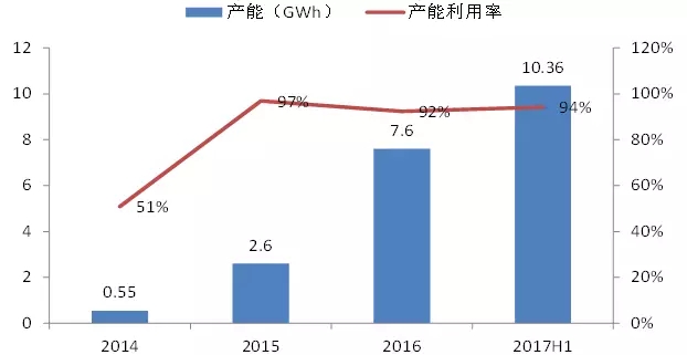 伴隨旺盛的行業(yè)需求,公司產(chǎn)能也隨之大幅增長(zhǎng),2017年H1時(shí)達(dá)到10.36GWh(年化數(shù)據(jù)),而產(chǎn)能利用率一直維持在90%以上,顯示公司的產(chǎn)品市場(chǎng)接受度極高。