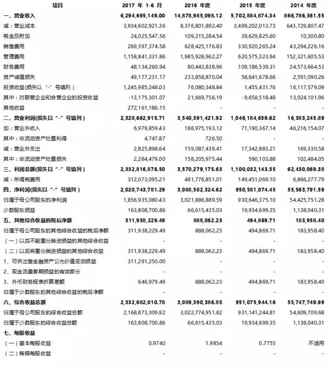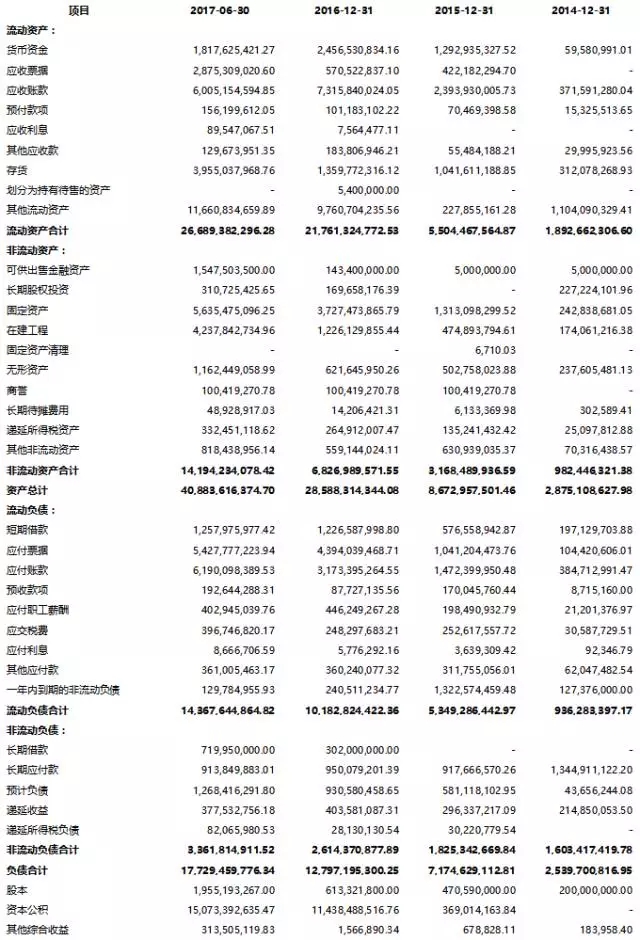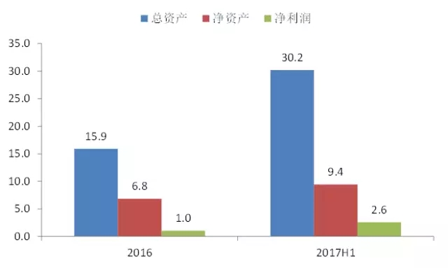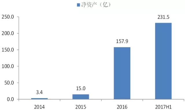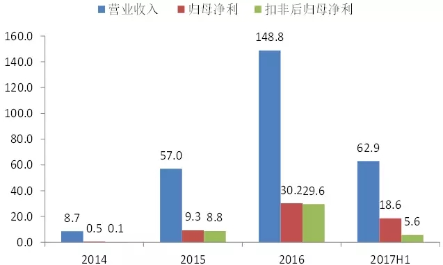 公司自2014年以來維持驚人增速,2016年和2017年1-6月份的營(yíng)收分別為148.8億和62.9億,凈利潤(rùn)分別為30.2億和18.6億(2017H1扣非后凈利為5.6億)。公司2014年底凈資產(chǎn)為3.4億,2017年H1末為231.5億元,對(duì)比增長(zhǎng)了68倍。