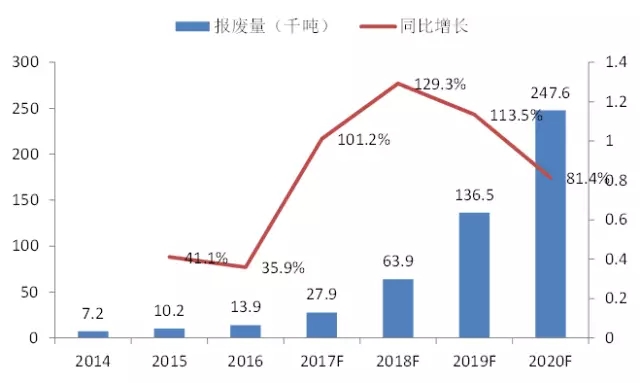 2015年動(dòng)力電池進(jìn)入爆發(fā)期,而這一部分電池在2018年開始進(jìn)入退役期,隨著動(dòng)力電池報(bào)廢規(guī)模逐步增長(zhǎng)、動(dòng)力電池回收規(guī)則明確、回收渠道規(guī)范、動(dòng)力電池拆解回收技術(shù)進(jìn)步,鋰電池梯次利用和報(bào)廢回收的規(guī)模將逐年擴(kuò)大,根據(jù)高工鋰電預(yù)測(cè)數(shù)據(jù),2020年國(guó)內(nèi)鋰電池報(bào)廢數(shù)量有望達(dá)到24.76萬噸,對(duì)比2016年增長(zhǎng)17.8倍,行業(yè)未來幾年將呈現(xiàn)爆發(fā)式增長(zhǎng)。