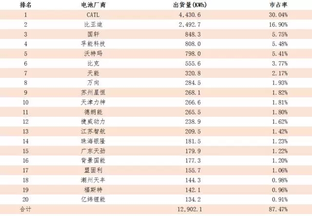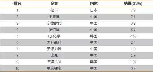 表6:2016年全球動(dòng)力電池企業(yè)銷量排行榜