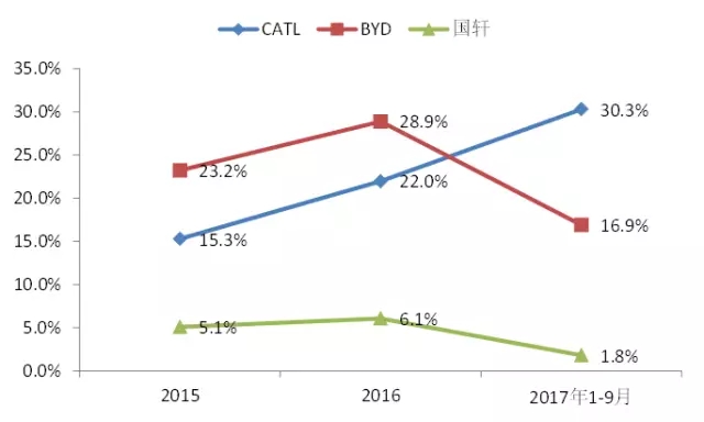 根據(jù)中國(guó)市場(chǎng)調(diào)查網(wǎng)統(tǒng)計(jì)數(shù)據(jù),公司在2016年電池銷售量6.8GWh排名全球第三。而根據(jù)真鋰研究的最新數(shù)據(jù),2017年前三季度公司累計(jì)電池裝機(jī)總量已經(jīng)全面超越比亞迪、國(guó)內(nèi)市占率達(dá)到30%,優(yōu)勢(shì)穩(wěn)固。