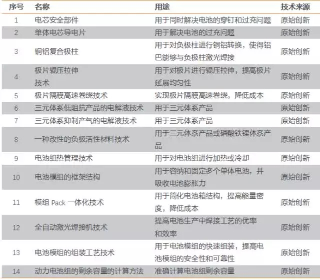 截至2017年9月30日,公司及其子公司共擁有813項(xiàng)境內(nèi)專利及13項(xiàng)境外專利,涵蓋了材料、電芯設(shè)計(jì)、電池組、電池包、儲(chǔ)能系統(tǒng)等領(lǐng)域。其中核心技術(shù)及技術(shù)來源如下: