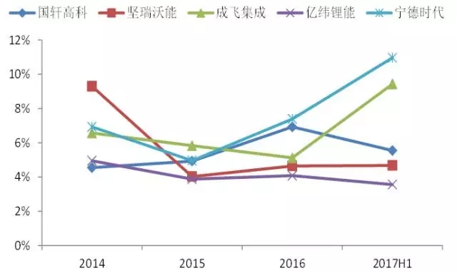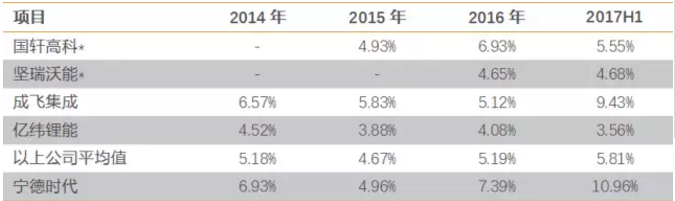 (2)研發(fā)費(fèi)用占比:寧德時(shí)代在研發(fā)投入方面持續(xù)發(fā)力,整體研發(fā)投入占比高、2017年H1已經(jīng)突破10%,處于同行較高水平,研發(fā)費(fèi)用占主營(yíng)業(yè)務(wù)的比例隨著整體體量的增大反而不斷提升。