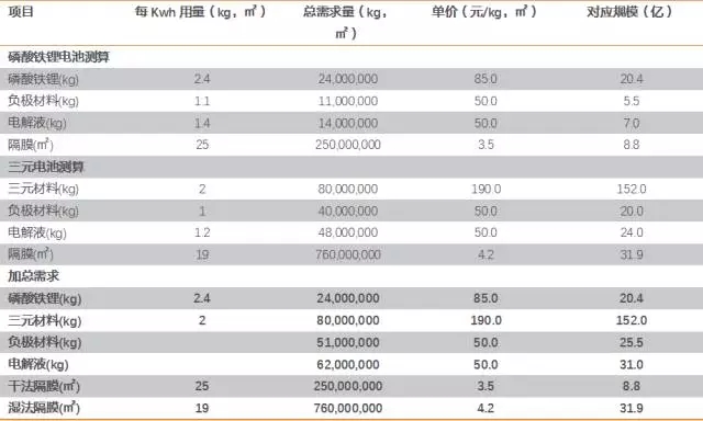 根據(jù)寧德時(shí)代17年上半年的產(chǎn)能,以及募投產(chǎn)能建設(shè)規(guī)劃,我們預(yù)計(jì)公司2020年產(chǎn)能將超過50Gwh,如果算上與上汽的合資公司時(shí)代上汽,則實(shí)際產(chǎn)能有可能遠(yuǎn)超這個(gè)數(shù)字。我們假設(shè)公司2020年出貨量為50GWh(其中磷酸鐵鋰電池10GWh,三元電池40GWh),在國(guó)內(nèi)動(dòng)力電池市占率有望達(dá)到45%左右,則可據(jù)此測(cè)算出其對(duì)原材料的需求量。